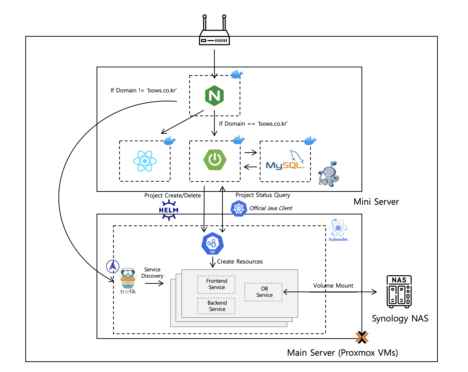 bows.co.kr이면 docker compose로 띄운 certbot과 volume을 통해 ssl 인증을 하고, bows.co.kr 도메인이 아니면 뒷단으로 https 그대로 넘겨버려서 뒷단의 k8s의 cert-manager와 traefik이 알아서 ssl을 처리하도록 설정한다. 아래 아키텍쳐를 보면 조금 직관적으로 이해가 가능하다.