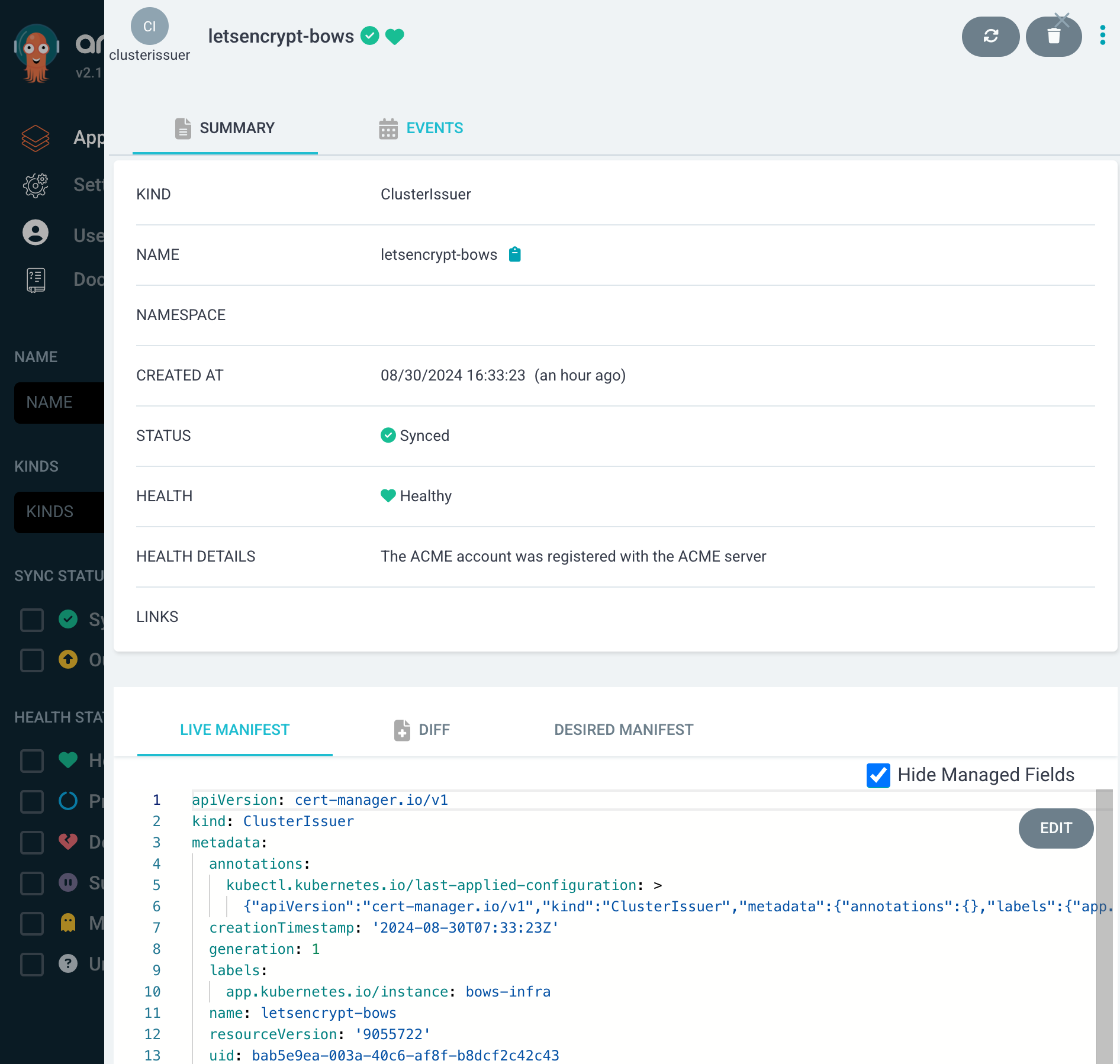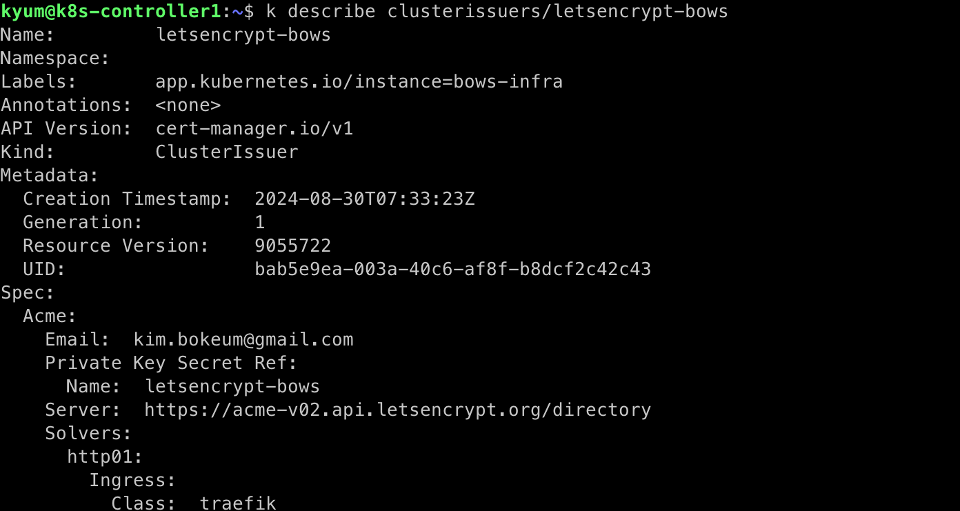 k8s 클러스터에도 확인해보면, 내가 정의한대로 cluster issuer가 잘 배포된 것을 확인할 수 있다.