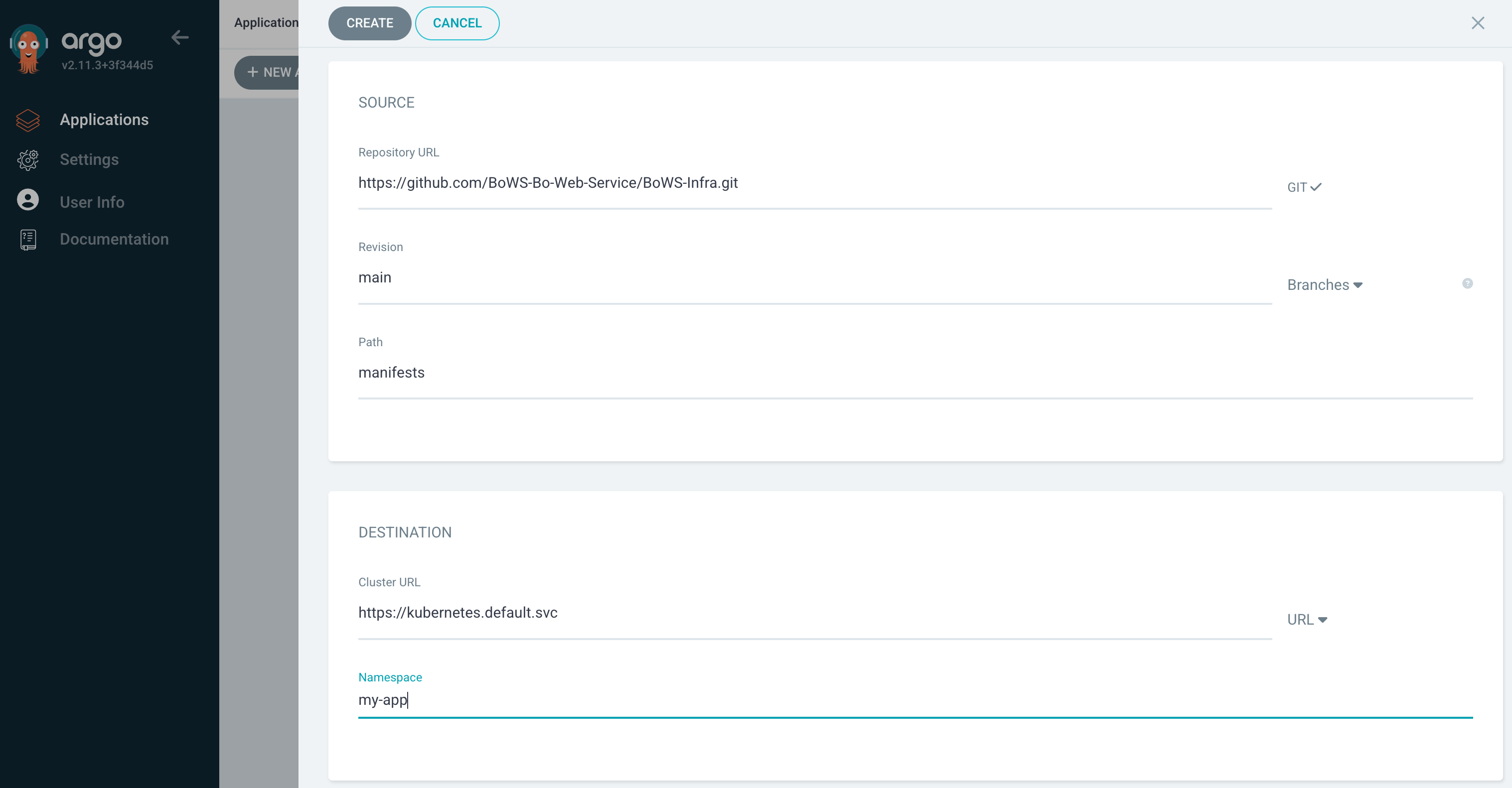 Applications에서 '+ NEW APP' 버튼을 눌러 필요한 정보를 입력한 뒤 GitHub에 업로드 되어 있는 manifest를 애플리케이션으로 배포한다. 어느 브랜치와 어떤 디렉토리를 봐야할지, 어느 클러스터에 배포할지 등을 적어준다(클릭하면 기본값 등이 나오니 그것을 이용하면 편하게 빈칸들을 채울 수 있다)