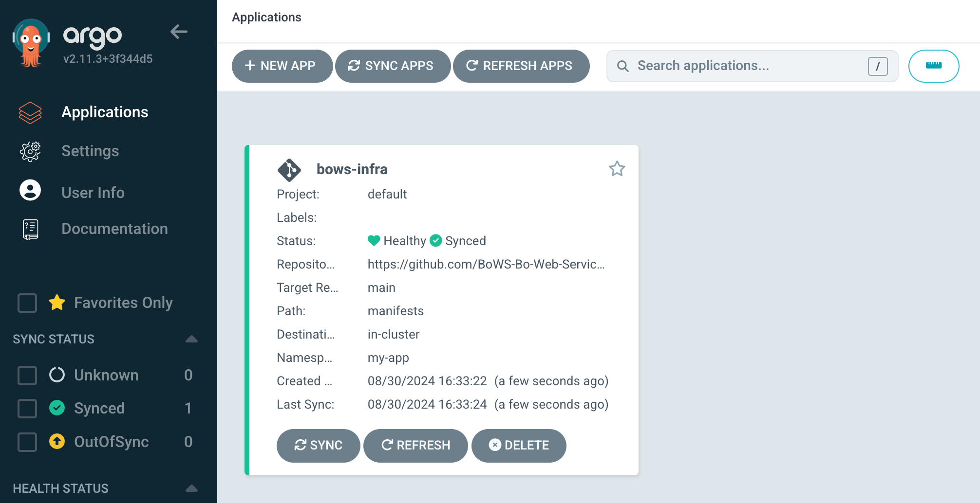 이때 Project는 default로 설정했는데, 만약 하나의 프로젝트를 생성해서 argocd의 배포와 역할 등을 세밀하게 제어하고 싶다면 settings의 Projects를 클릭하여 생성, 등록해주면 된다. 이 블로그 포스트에 자세히 설명되어 있으니 참고하면 좋을 것 같다. 나의 경우 시도하다가 굳이 지금 단계에서는 필요없을 것 같아 default project에 진행했다.
