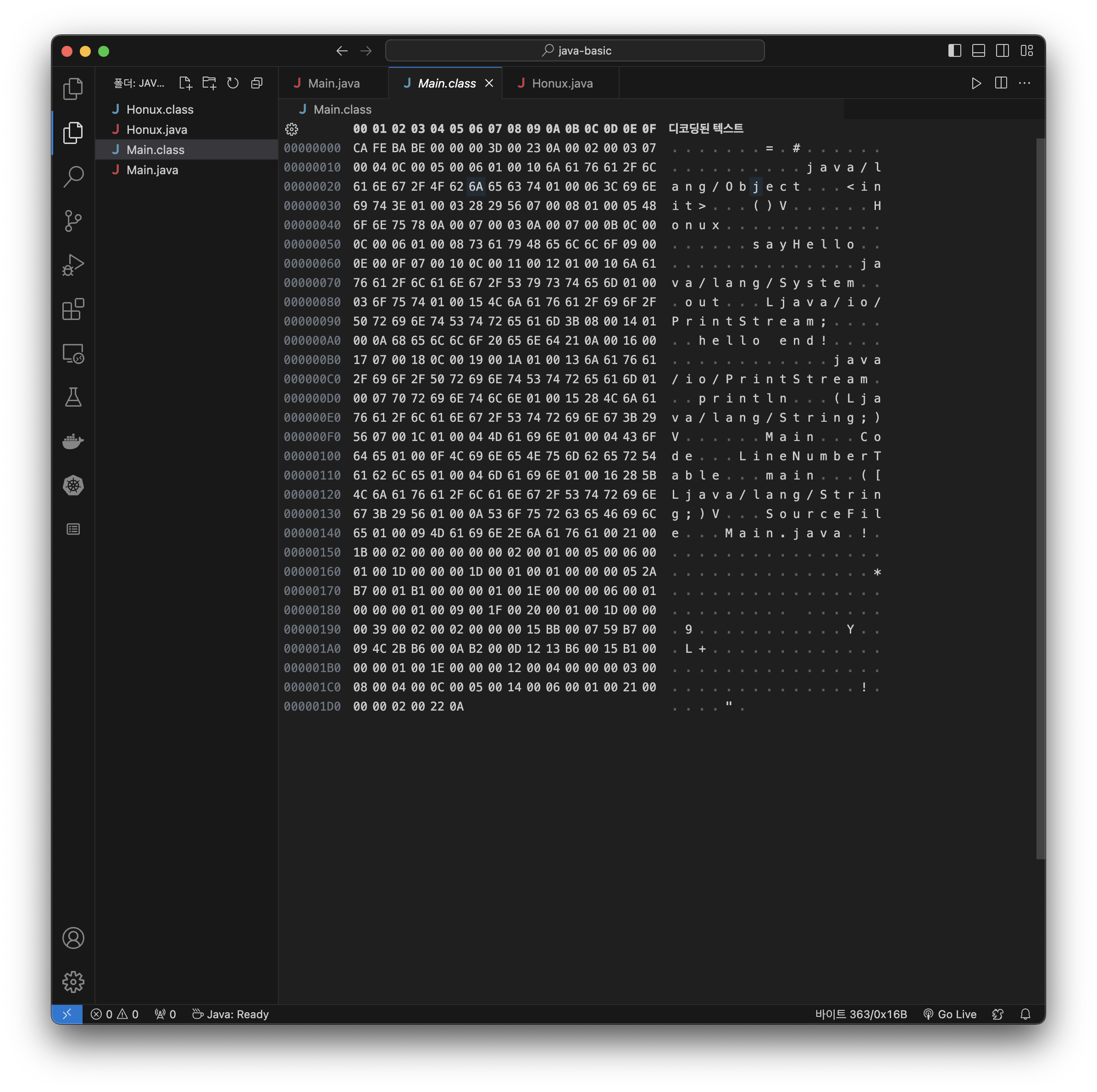 자바 바이트코드는 아래와 같이 16진수로 표현할 수 있다. 컴파일 결과물(.class 파일)을 hex editor로 보면 아래와 같이 나온다.