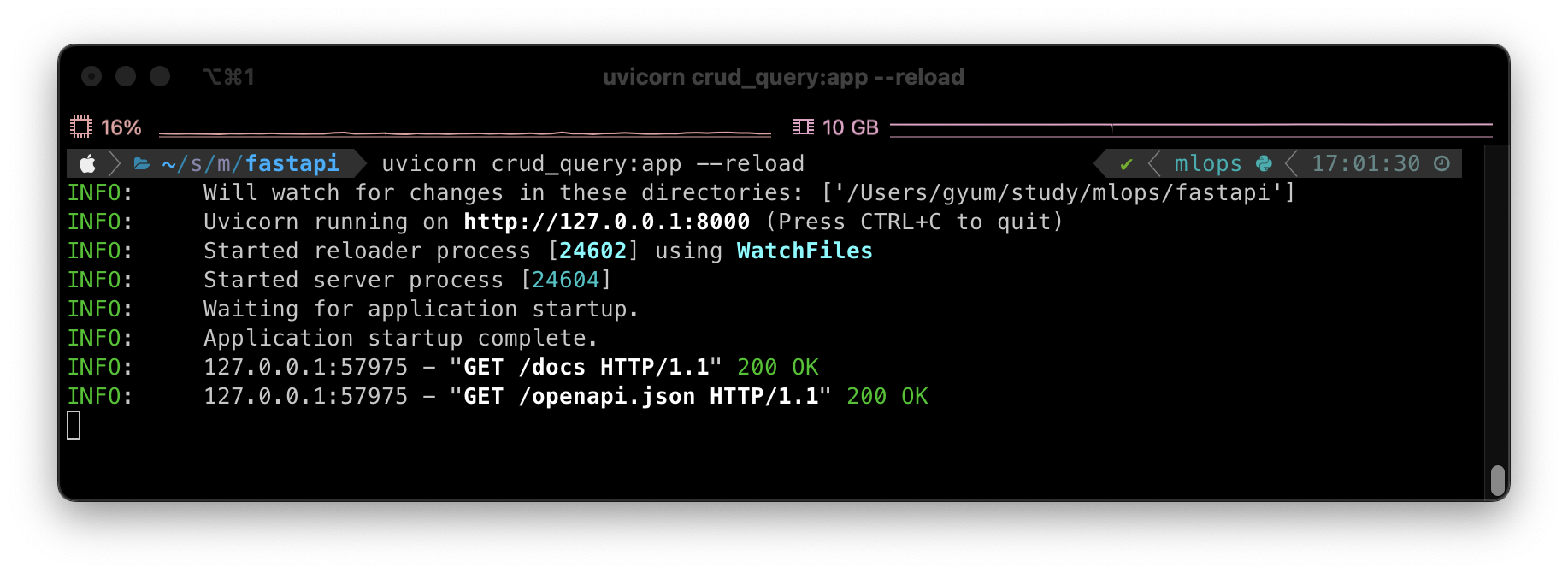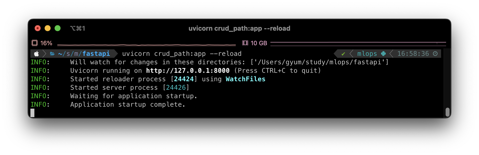 - --reload: 코드가 바뀌었을 때 서버가 재시작할 수 있도록 해주는 옵션