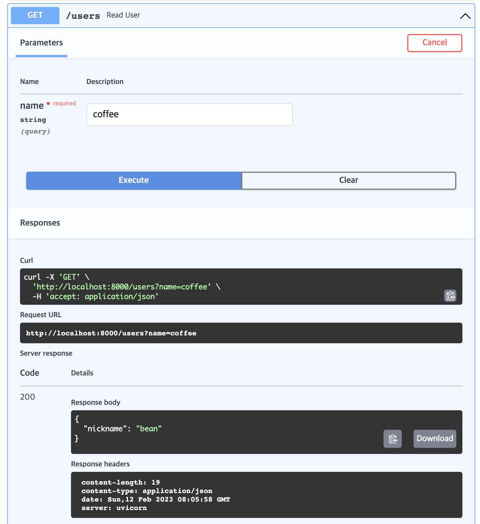 - R: 이름을 받아 해당 이름을 지닌 사용자의 별명 반환 (이름 없으면 HTTPException)