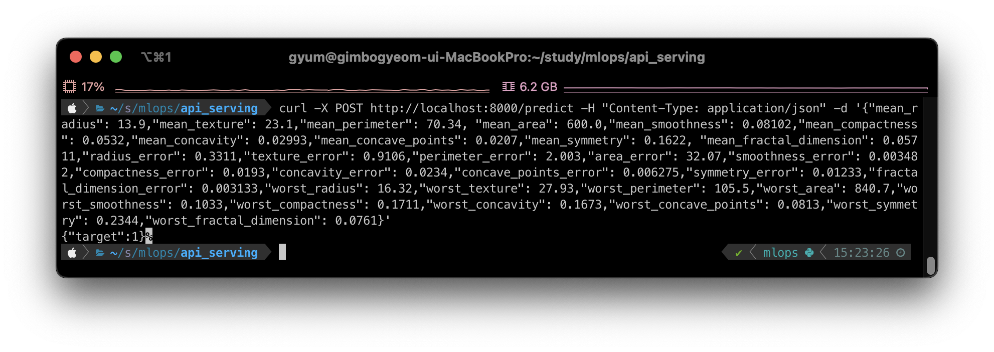 흐름: minio로 되어 있는 artifact store에서 모델을 mlflow를 통해 로컬에 다운받고 -> 파라미터 값들을 작성해서 api 호출을 하면 -> 내 로컬에서 api로 전달된 값을 바탕으로 모델 inference를 하고 -> inference 결과값을 클라이언트에 반환해주는 방식으로 만들기