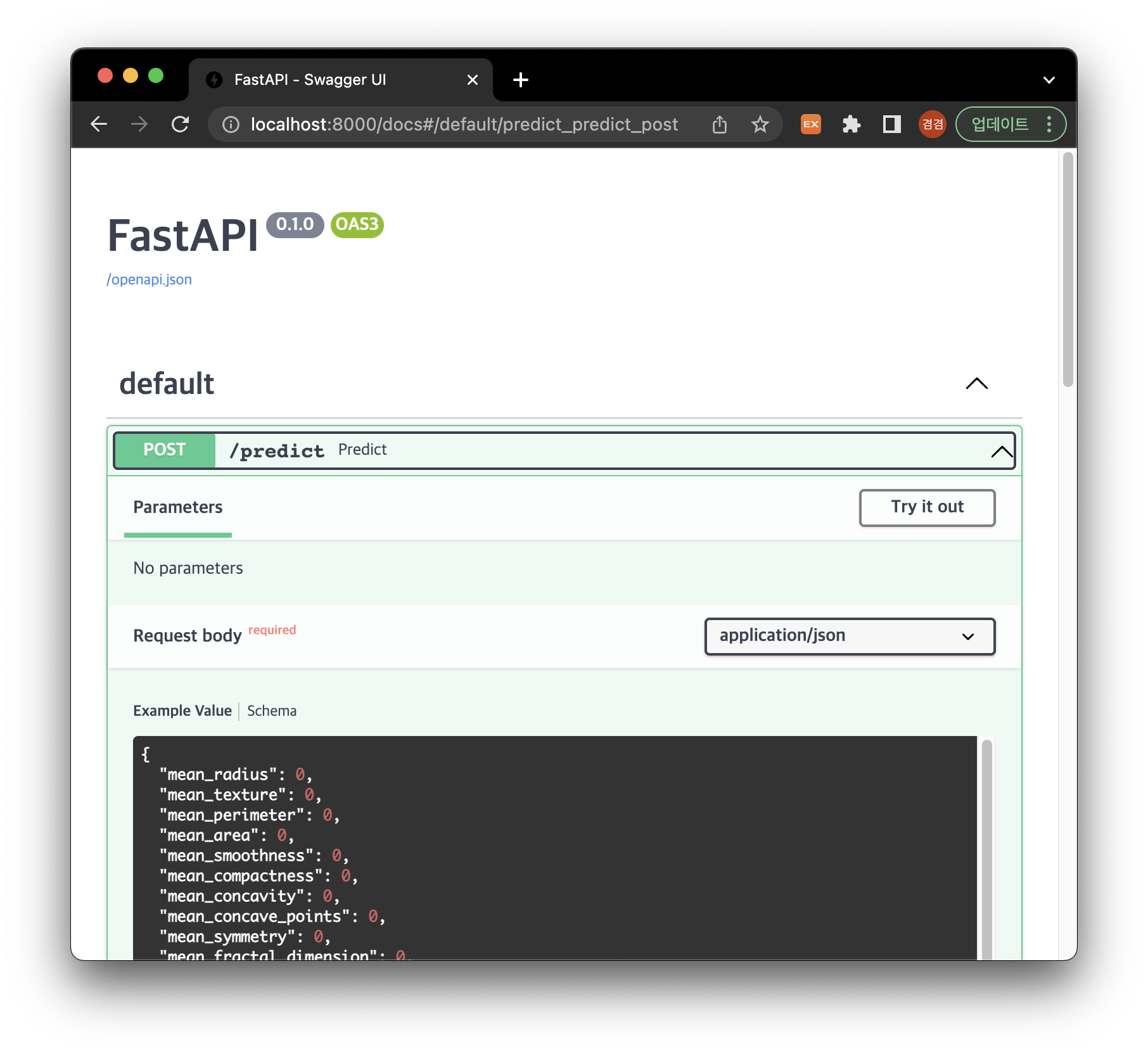 swagger UI로 확인하기 & 데이터 날려보기 => predict 결과값을 잘 반환해줌