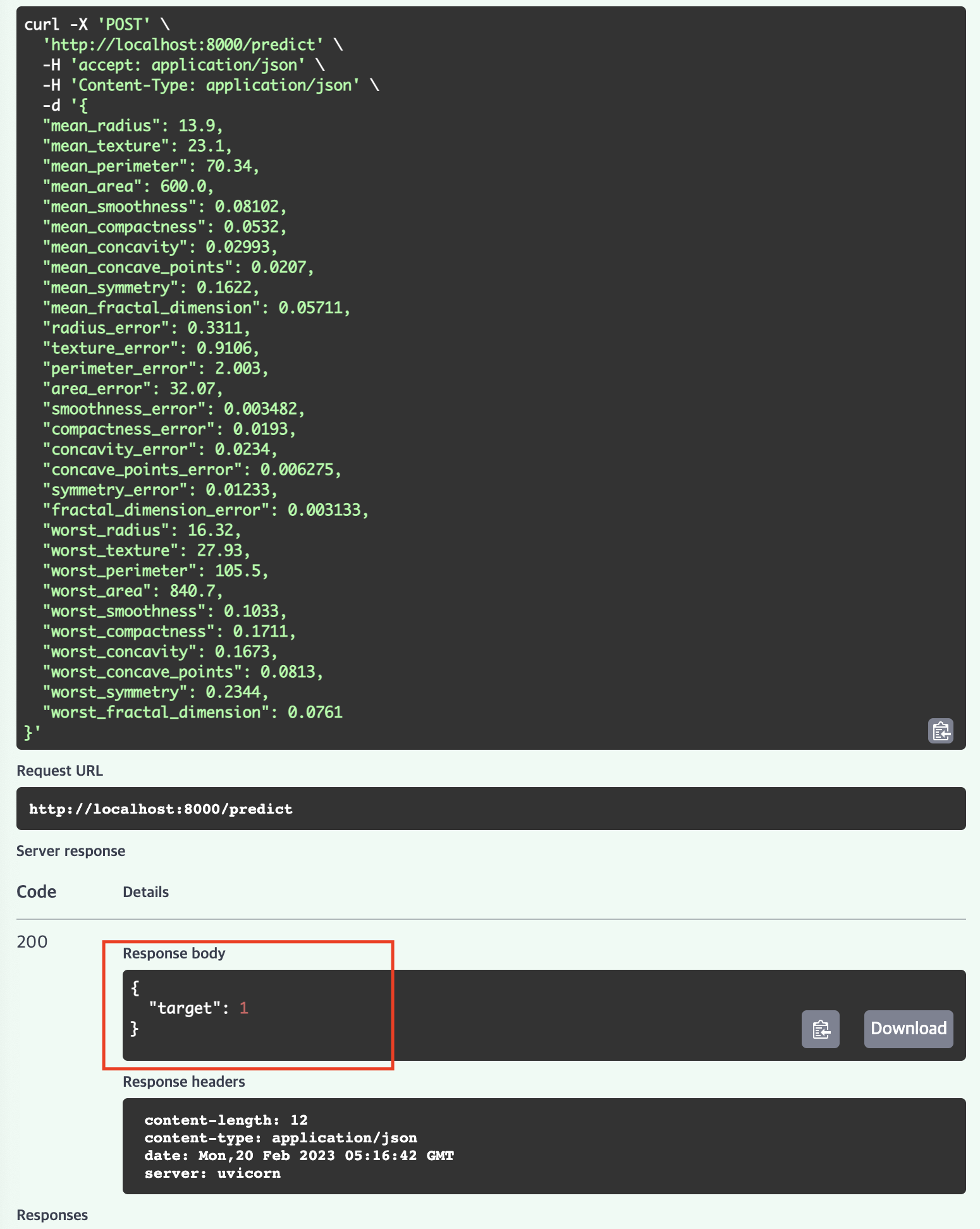 curl -X POST http://localhost:8000/predict -H "Content-Type: application/json" -d '{"mean_radius": 13.9,"mean_texture": 23.1,"mean_perimeter": 70.34, "mean_area": 600.0,"mean_smoothness": 0.08102,"mean_compactness": 0.0532,"mean_concavity": 0.02993,"mean_concave_points": 0.0207,"mean_symmetry": 0.1622, "mean_fractal_dimension": 0.05711,"radius_error": 0.3311,"texture_error": 0.9106,"perimeter_error": 2.003,"area_error": 32.07,"smoothness_error": 0.003482,"compactness_error": 0.0193,"concavity_error": 0.0234,"concave_points_error": 0.006275,"symmetry_error": 0.01233,"fractal_dimension_error": 0.003133,"worst_radius": 16.32,"worst_texture": 27.93,"worst_perimeter": 105.5,"worst_area": 840.7,"worst_smoothness": 0.1033,"worst_compactness": 0.1711,"worst_concavity": 0.1673,"worst_concave_points": 0.0813,"worst_symmetry": 0.2344,"worst_fractal_dimension": 0.0761}'
