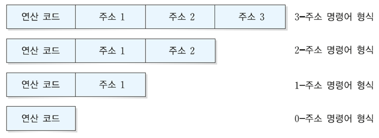 오퍼랜드에는 명령어 안에 없을 수도, 1개~3개가 있을 수도 있다. 오퍼랜드의 수에 따라 '0-주소 명령어 형식', '1-주소 명령어 형식', '2-주소 명령어 형식', '3-주소 명령어 형식'으로 부른다