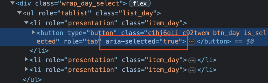 따라서, 크롤링하는 입장에서는 해당 시간표 페이지에 접근하고, aria-selected가 true된 텍스트만 찾는다면 그 날이 어떤 날짜인지 알아낼 수 있으며, 해당 부분에 대한 시간표만 크롤링할 수 있다. 작성한 코드는 아래와 같다