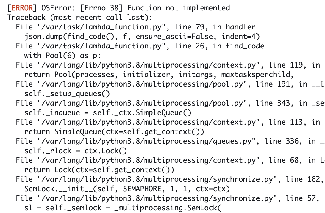 Due to the Lambda execution environment not having /dev/shm (shared memory for processes) support, you can’t use multiprocessing.Queue or multiprocessing.Pool.