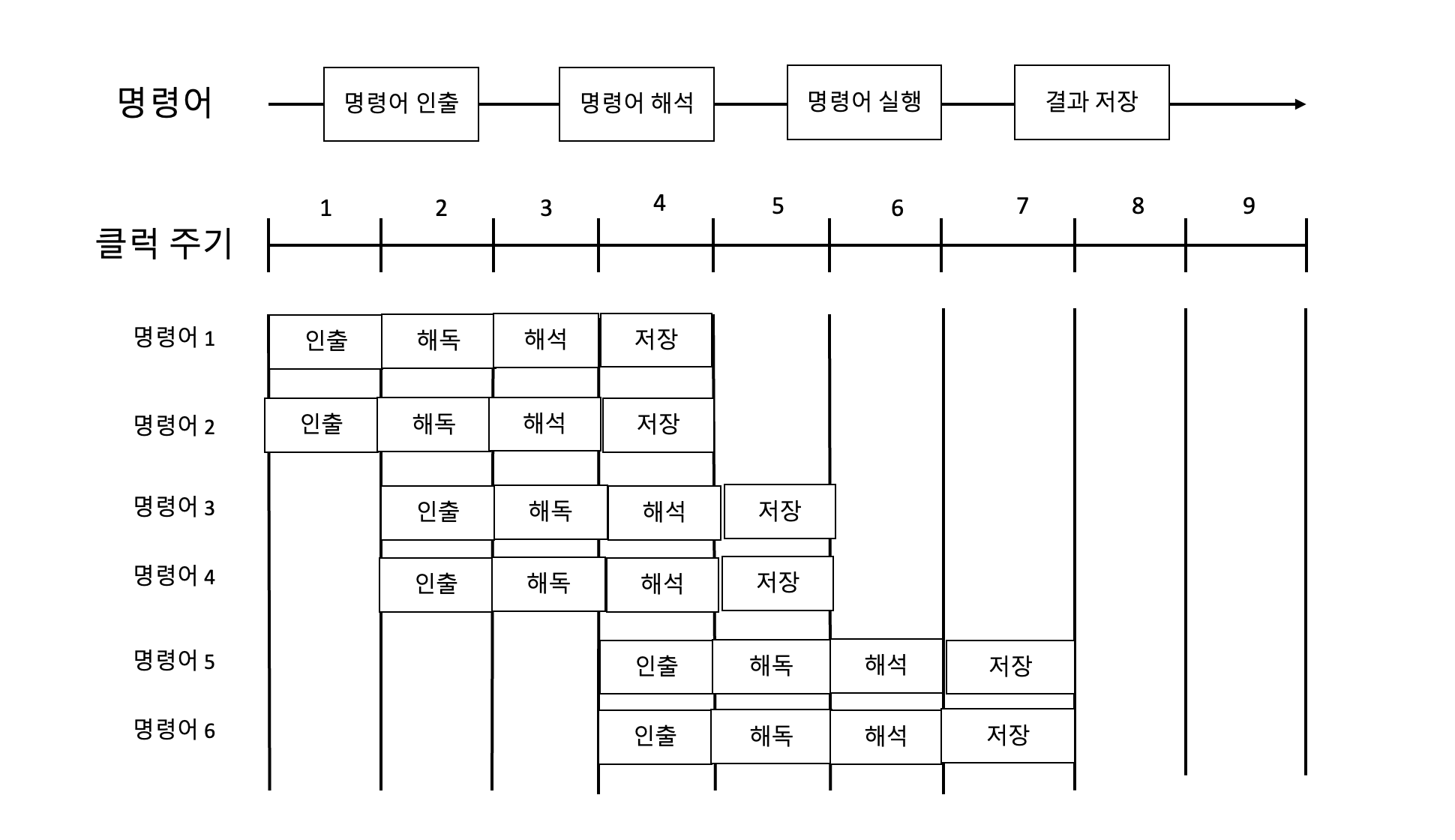 명령어를 동시 처리하는 기법을 명령어 파이프라이닝(Instruction Pipelining)이라고 함.