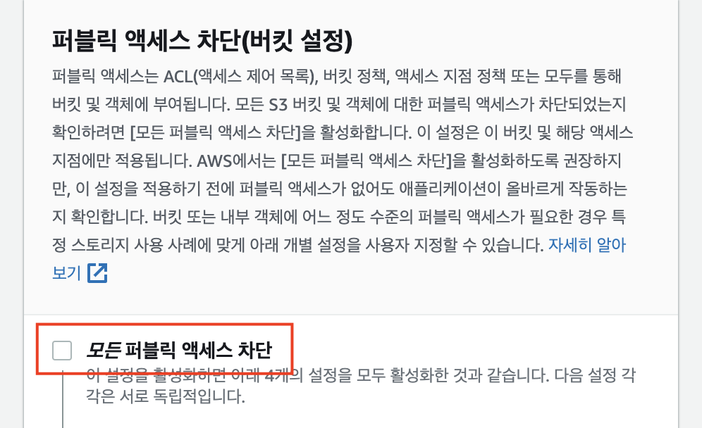 1) 버킷의 공개 액세스 차단(버킷 설정) 부분 만지기
