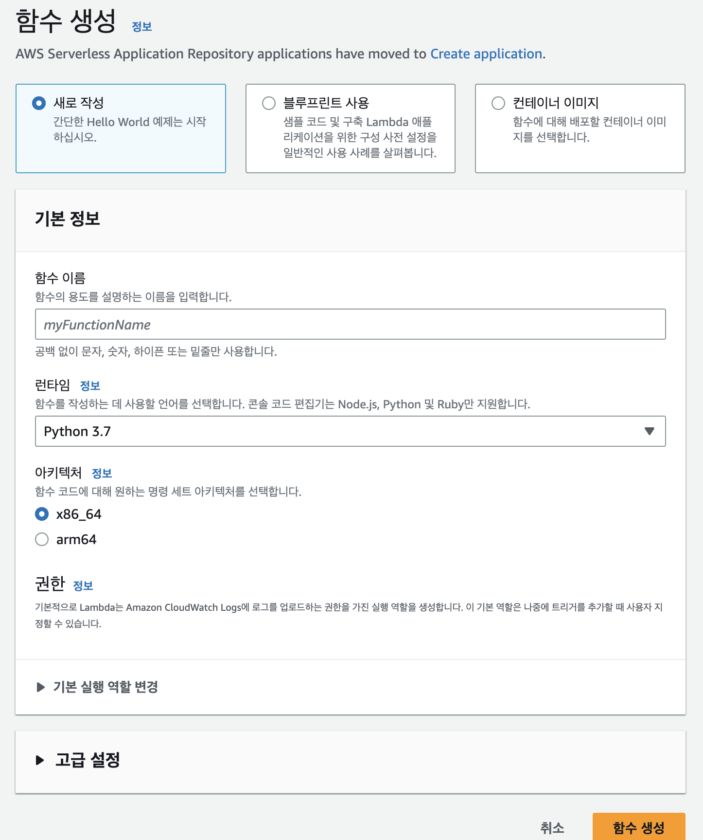 새로 작성을 누를 경우 lambda 위에서 직접 코드를 적는 방식, 컨테이너 이미지를 누르면 코드를 직접 입력하는게 아니라 도커 이미지와 같은 컨테이너 이미지를 lambda 위에 올릴 수 있다. 나의 경우 이번에는 직접 lambda 위에 코드를 작성하기 위해 '새로 작성'으로 선택했다.