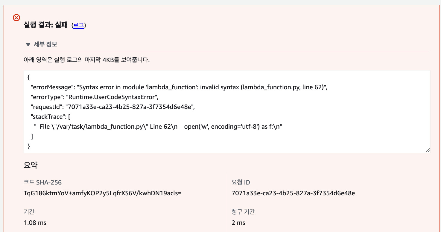 실패한다면 빨간창이 나온다. 세부 정보 토글을 눌러 에러 메시지와 함수가 돌아간 시간, 메모리 구성 등을 확인할 수 있다. 이 기록들을 바탕으로 코드 혹은 람다의 구성을 수정해주자.