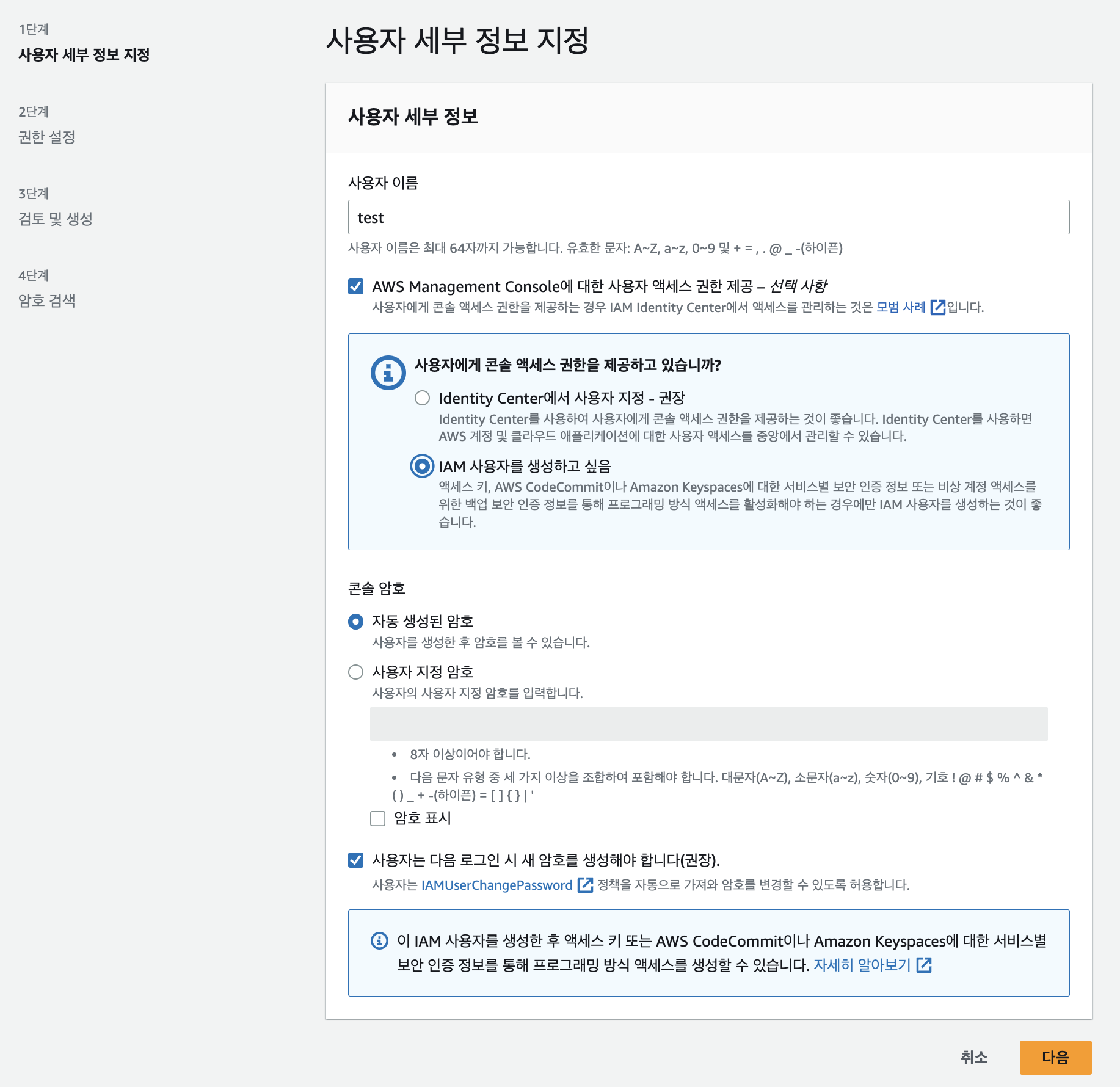 사용자 생성하는 절차를 진행해준다 (나는 management console에 대해 엑세스 권한을 제공하고 싶어서 선택했다)