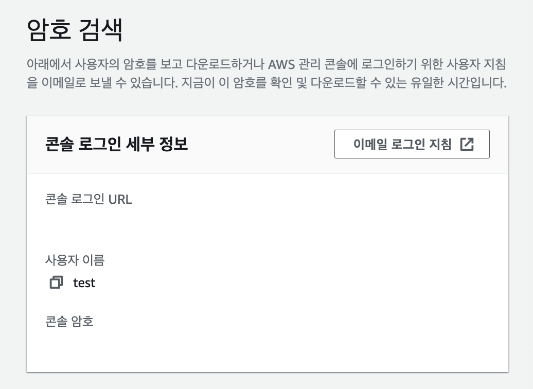 다음 페이지에서 사용자 생성을 클릭하면, 오른쪽 그림과 같이 콘솔 로그인 URL과 사용자 이름, 콘솔 암호를 확인할 수 있다. 이 정보들은