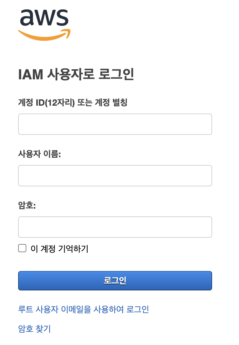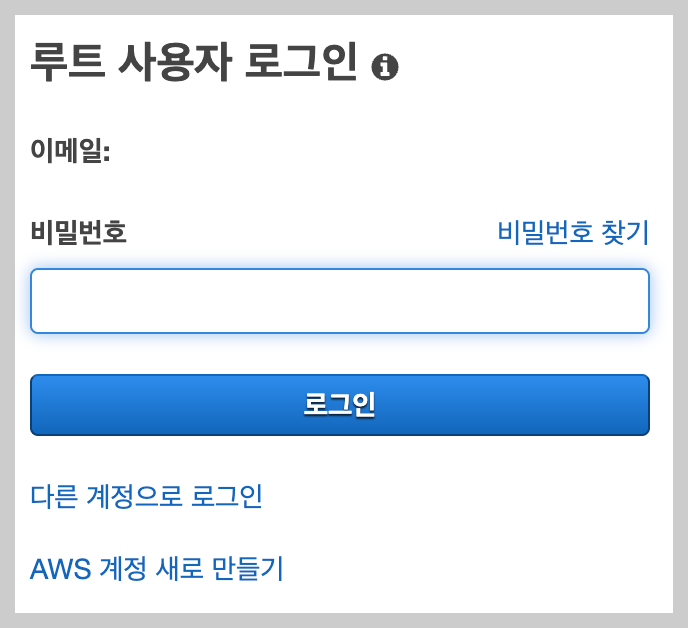 이렇게 생겨먹은 AWS 로그인 페이지에서 사용하여 접속할 때 필요하다. 로그인 URL로 페이지에 접속하고, 사용자 이름과 암호를 적어 로그인 하면 된다. 지금은 우선 루트 계정으로 돌아오자