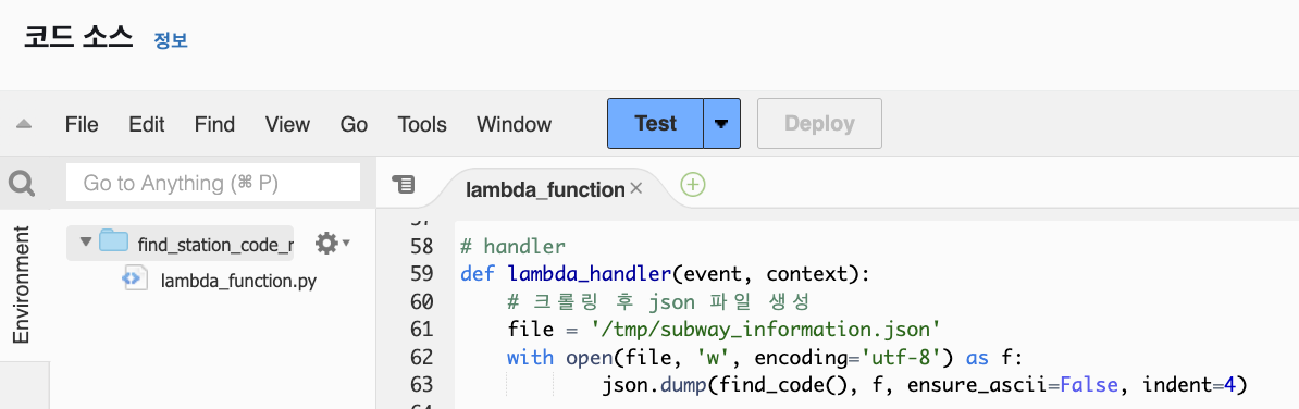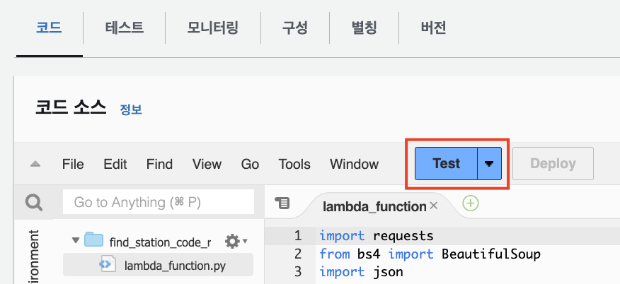 코드 수정이 완료된 이후에는 코드가 람다 위에서 잘 돌아가는지 테스트 해봐야 할 것이다. 직접 람다에서 함수를 작성한 경우 deploy 옆에 test 버튼을 눌러 확인해볼 수 있다.