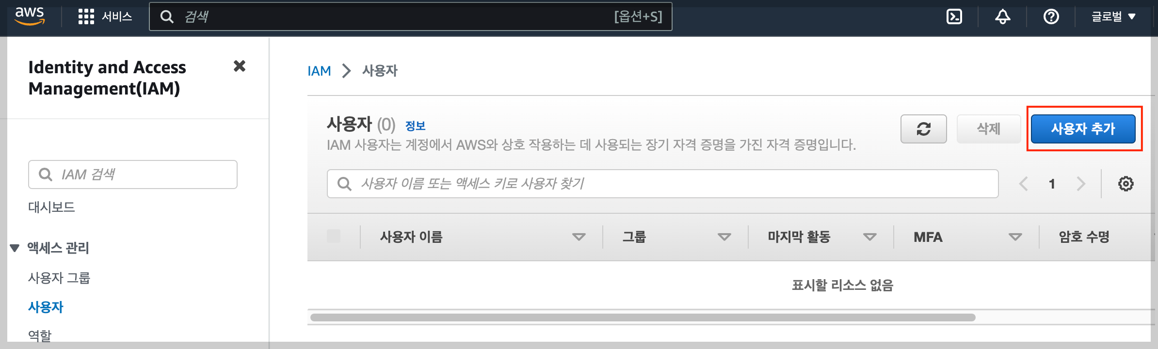 처음 들어갔을 경우 사용자가 없을 것이다. 우측 상단에 '사용자 추가' 버튼을 눌러 사용자를 추가해보자