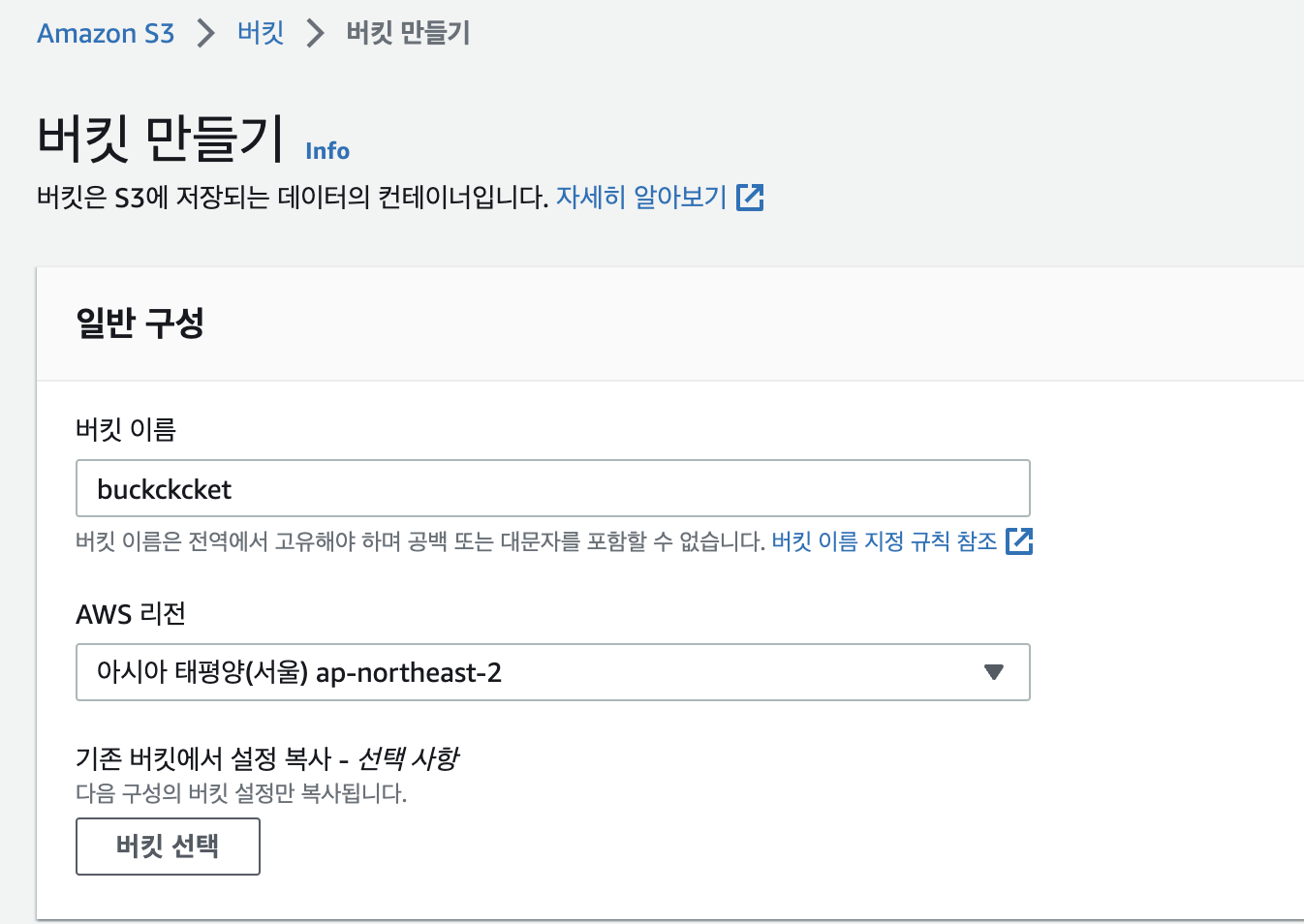 그 다음 버킷 이름과 여러 설정을 만져준다. (버킷 이름이 전역에서 고유해야 하기 때문에,,, 네이밍하는데 살짝 어려움을 겪을 수 있다. 그냥 대충 지으면 이미 있는 이름이더라고요...)