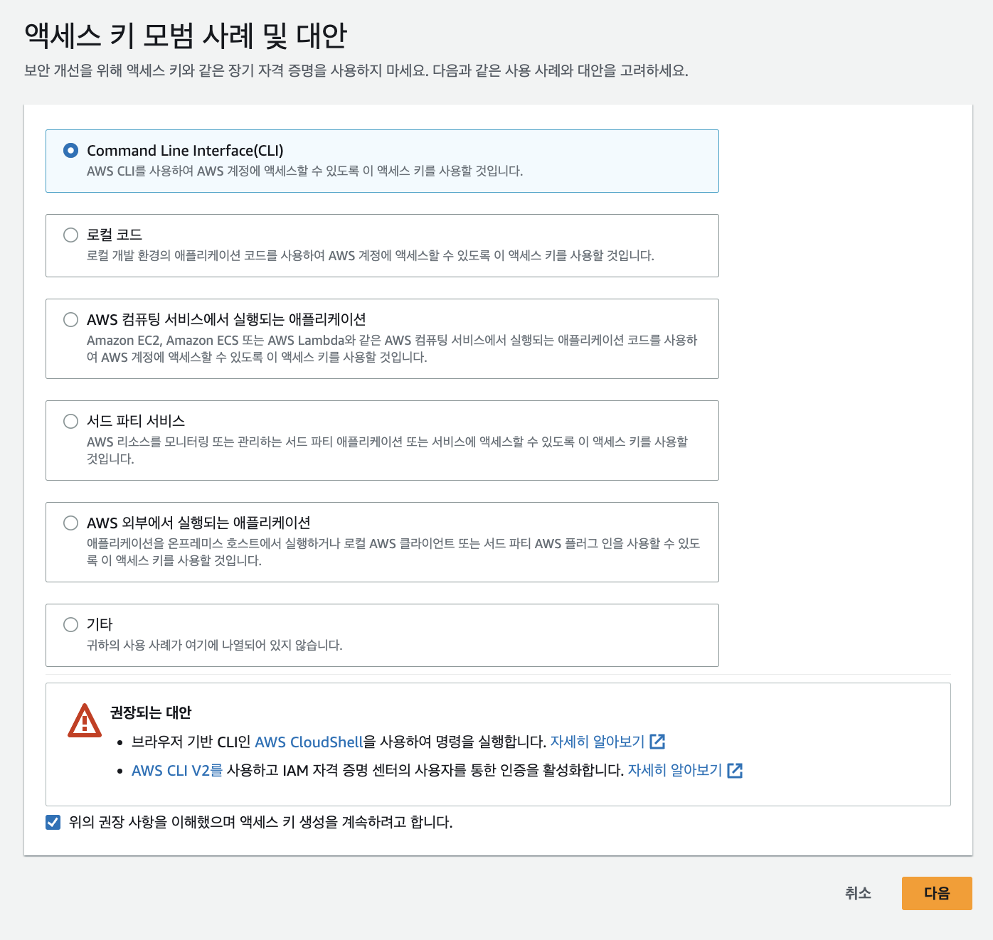자신의 상황에 맞는 엑세스 키를 만들자. 나는 CLI에서 사용할 엑세스 키를 발급받고 싶은 것이기 때문에 아래와 같은 옵션으로 발급하였다. 엑세스 키를 발급받으면 바로 텍스트를 복사해서 사용할 수도 있고, csv 파일로도 사용할 수 있다. (절대 외부에 노출되지 않도록 한다)