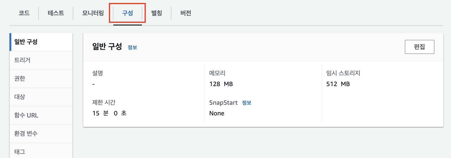 우선 가장 기본적인 것이 제한 시간. 이 제한 시간은 기본이 3초다. 즉, 람다가 돌아갈 수 있는 시간이 3초인 것이다. 람다는 코드가 돌아가는 시간을 기다려주지 않는데, 이로 인해서 함수가 실행되는 도중에 람다가 죽어버리는 사태가 발생할 수 있다. 따라서 최대 제한 시간인 15분으로 우선 설정하는 것이 정신건강에 이롭다. (이거 몰라서 한 2시간은 날렸던 것 같다...)