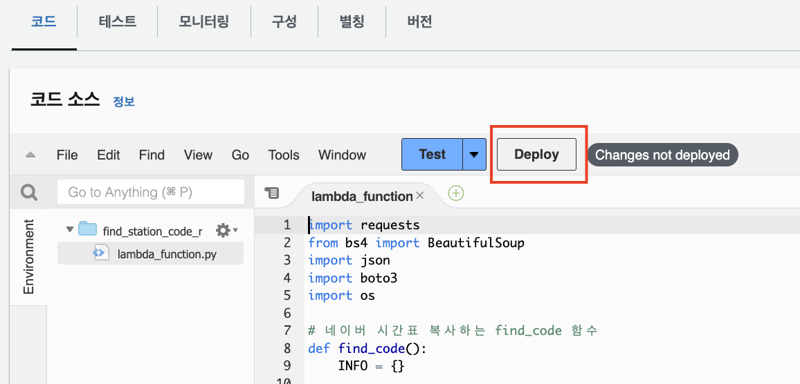 함수를 람다에서 직접 작성하는 경우 deploy 버튼을 눌러 수정사항을 배포해줘야 한다