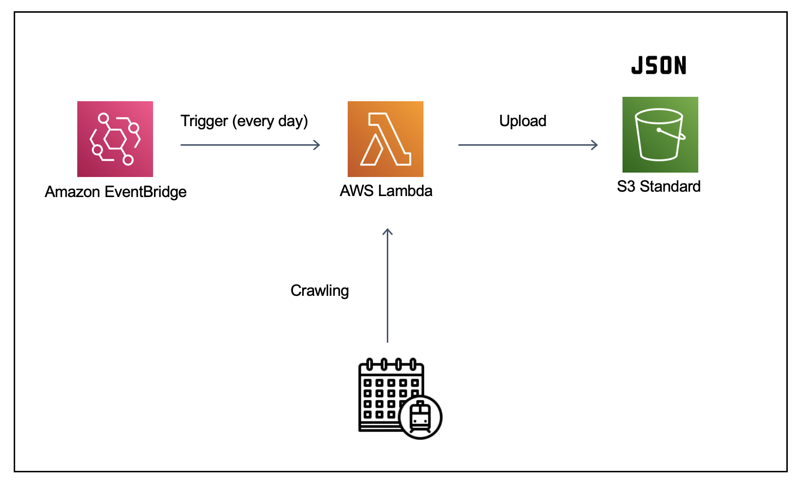 1) Lambda를 통해 서버리스로 크롤링 코드를 돌린다. 이때 Lambda 위에 올라가는 크롤링 코드의 최종 결과물은 json 파일로 저장한다