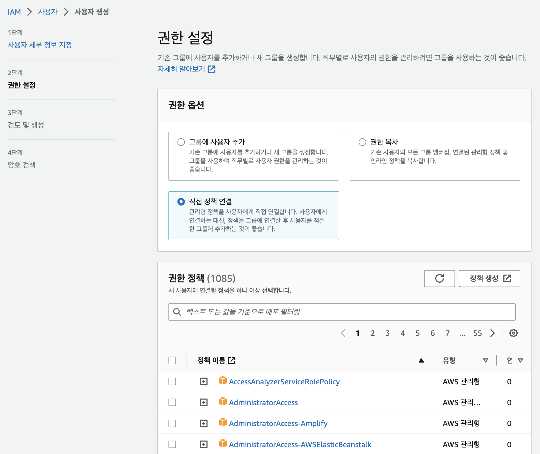 이후에는 권한 설정을 해줄 수 있다. '그룹에 사용자 추가'는 미리 생성된 그룹에 사용자를 추가하는 것이다. IAM에서는 그룹을 만들어 권한을 관리할 수 있는데, 예를 들어 개발 그룹에는 A와 B에 대한 권한, 운영 그룹에는 B에 대한 권한만 부여할 수 있는 것이다. 처음만들면 그룹이 없을터이니 직접 정책 연결을 클릭한다.