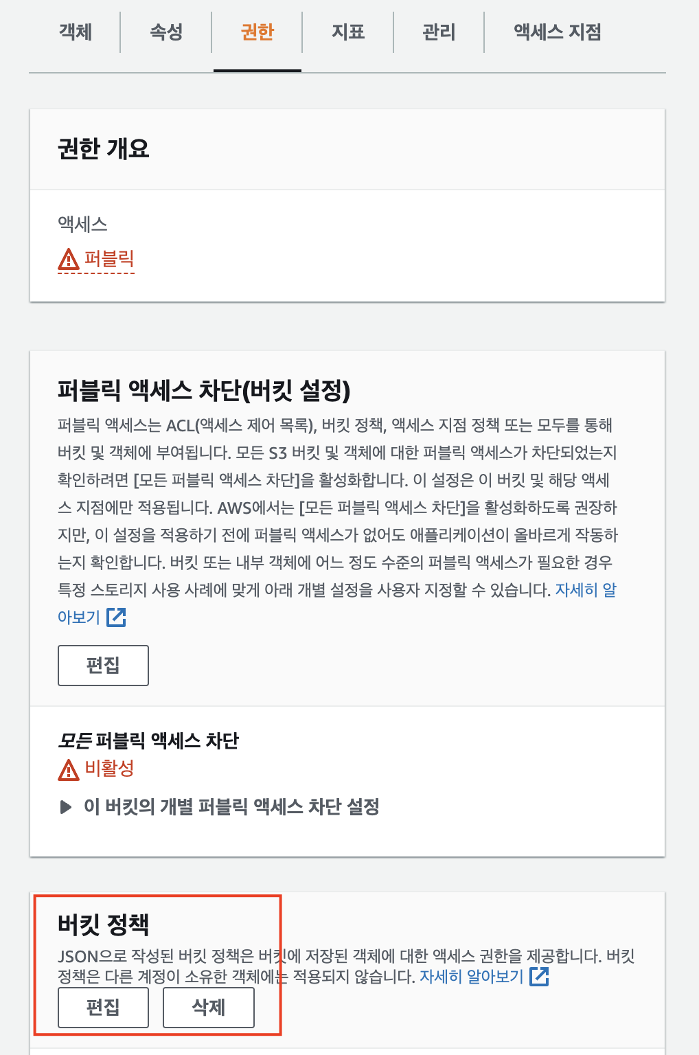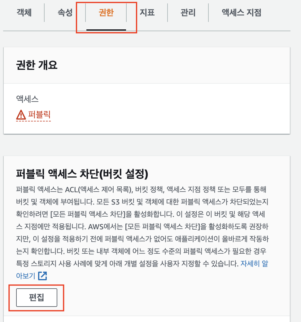 해당 S3 버킷으로 들어가서 권한 탭을 클릭, 퍼블릭 엑세스 차단에서 편집 버튼을 눌러준다