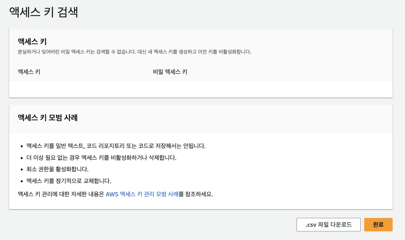 여튼 여기에서 발급받은 Access Key와 Secret Access Key는 아주 많은 곳에서 쓰이니 잘 보관해두자