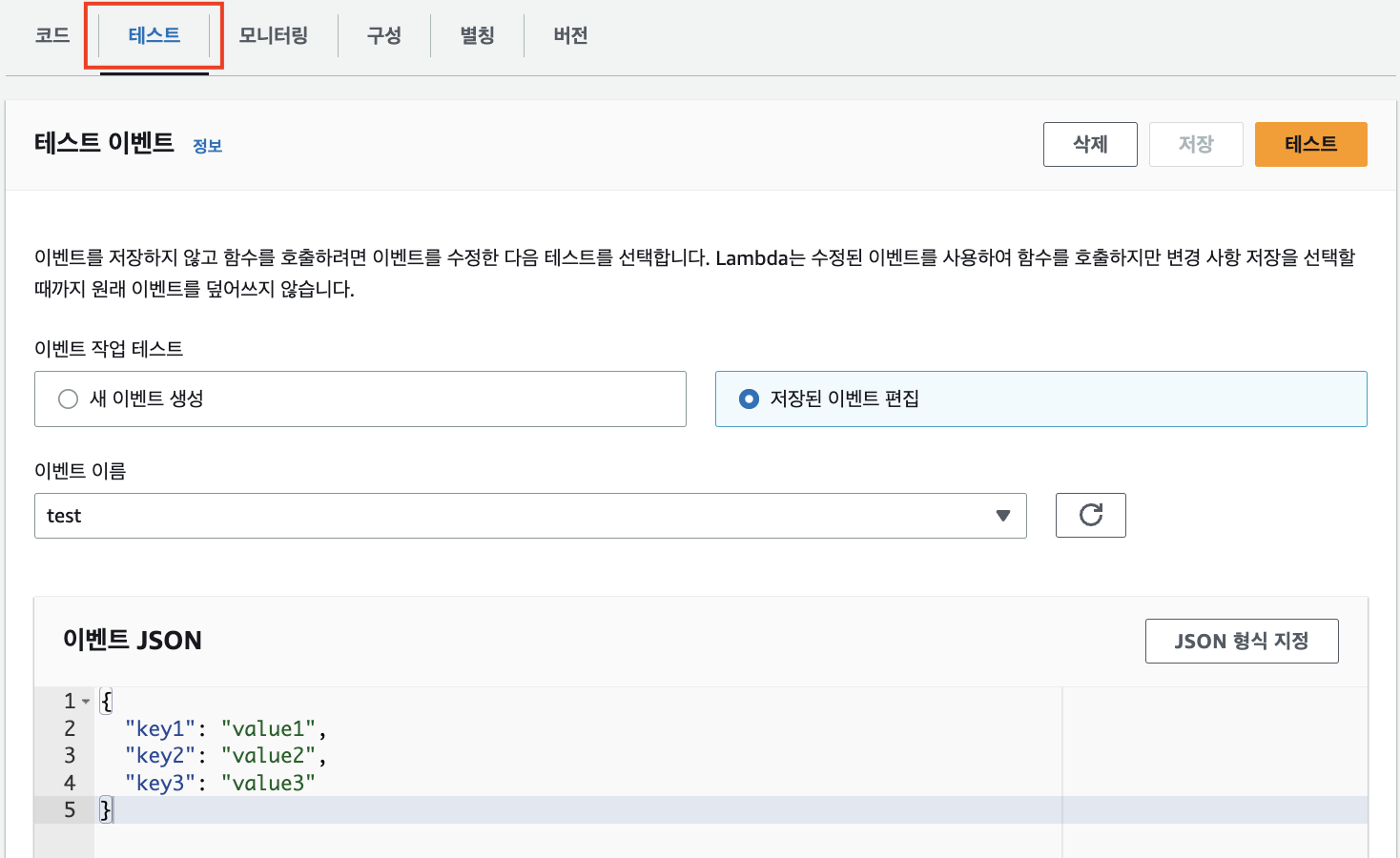 테스트 이벤트를 조금 더 세밀하게 구성해야 하거나, 도커 이미지 등으로 코드를 작성하여 올리는 경우 아래 '테스트'를 눌러서 진행해야 한다.
