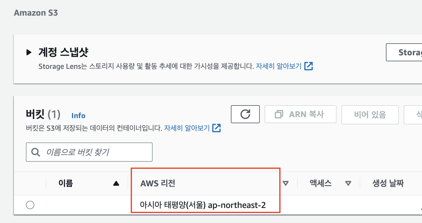버킷의 생성된 리전은 아래 빨간 박스 영역에서 확인 가능