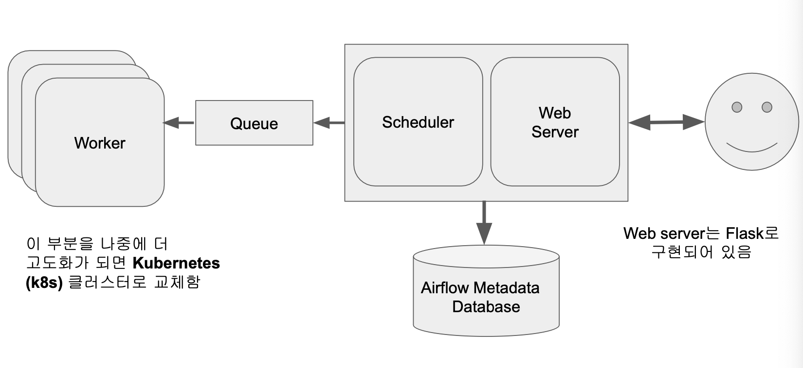 | Airflow 스케일링 - 스케일 업: 더 좋은 사양의 서버를 사용 - 스케일 아웃: 서버를 추가하는 것 => Docker와 K8S를 사용하여 스케일 아웃하는 방법을 사용함 |