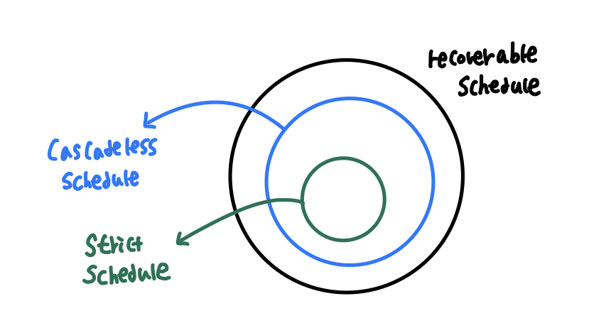 위에서 알아본 cascadeless schedule, strict schedule 모두 결국 recoverable schedule의 일부이다. 중요한 것은 DBMS가 concurrent한 트랜잭션을 처리함에 있어서 recoverability, 즉 롤백을 해도 이전의 상태로 온전히 돌아갈 수 있는 스케쥴만 허용해야 한다는 것이다.