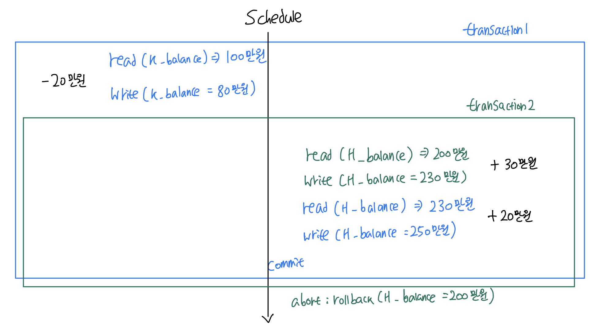 - Serial Schedule: 트랜잭션들이 겹치지 않고 한 번에 한 번씩 실행되는 스케쥴