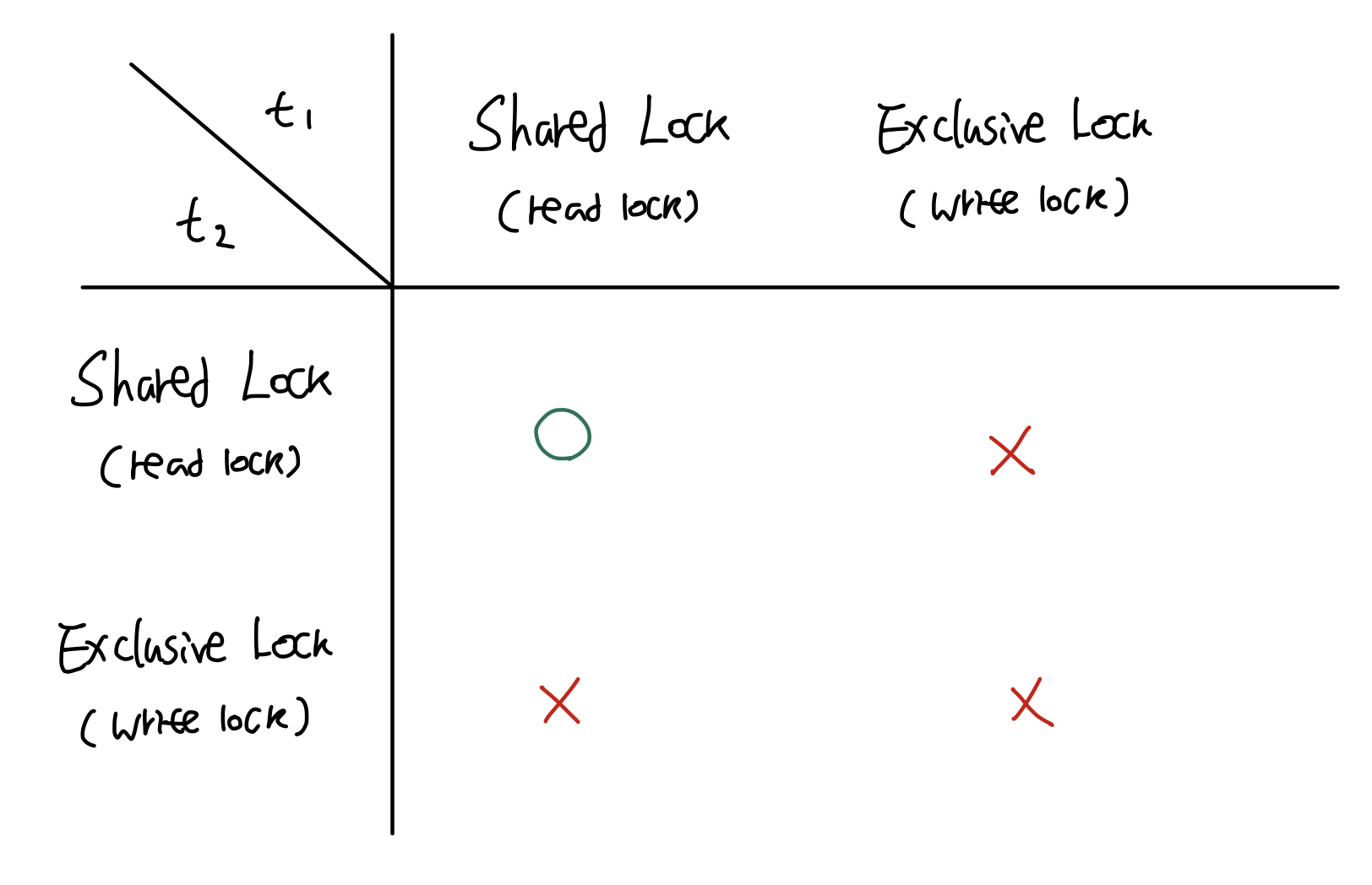 write lock (쓰기 잠금)이라고도 불리며, 한 트랜잭션이 데이터를 쓰고자 할 때 얻는 lock이다. (물론 이론적으로 Exclusive lock을 걸어두고 읽기만 하는 것도 가능) (이때 lock의 범위는 하나의 레코드가 될 수도 있고, 테이블 전체가 될 수 있다. 자세한건 데이터베이스마다 다름) exclusive lock을 걸게 되면 다른 트랜잭션은 해당 데이터에 대해서 읽지도, 쓰지도 못한다. 따라서 타 트랜잭션은 exclusive lock뿐만 아니라 바로 뒤에 나올 shared lock 또한 얻을 수 없게 된다. 말 그대로 배타적(exclusive)인 권한을 얻는 것이다.