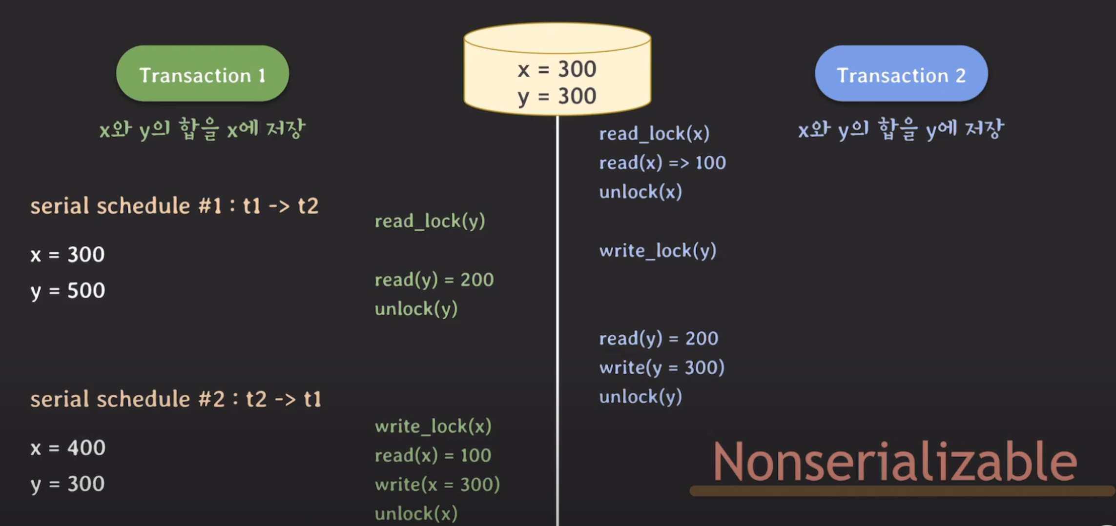 하지만 lock을 사용한다고 해서 반드시 스케쥴 간의 serialzability가 보장되는 것은 아니다. 아래처럼 lock을 사용해도 nonserializable한 스케쥴이 만들어질 수도 있다.