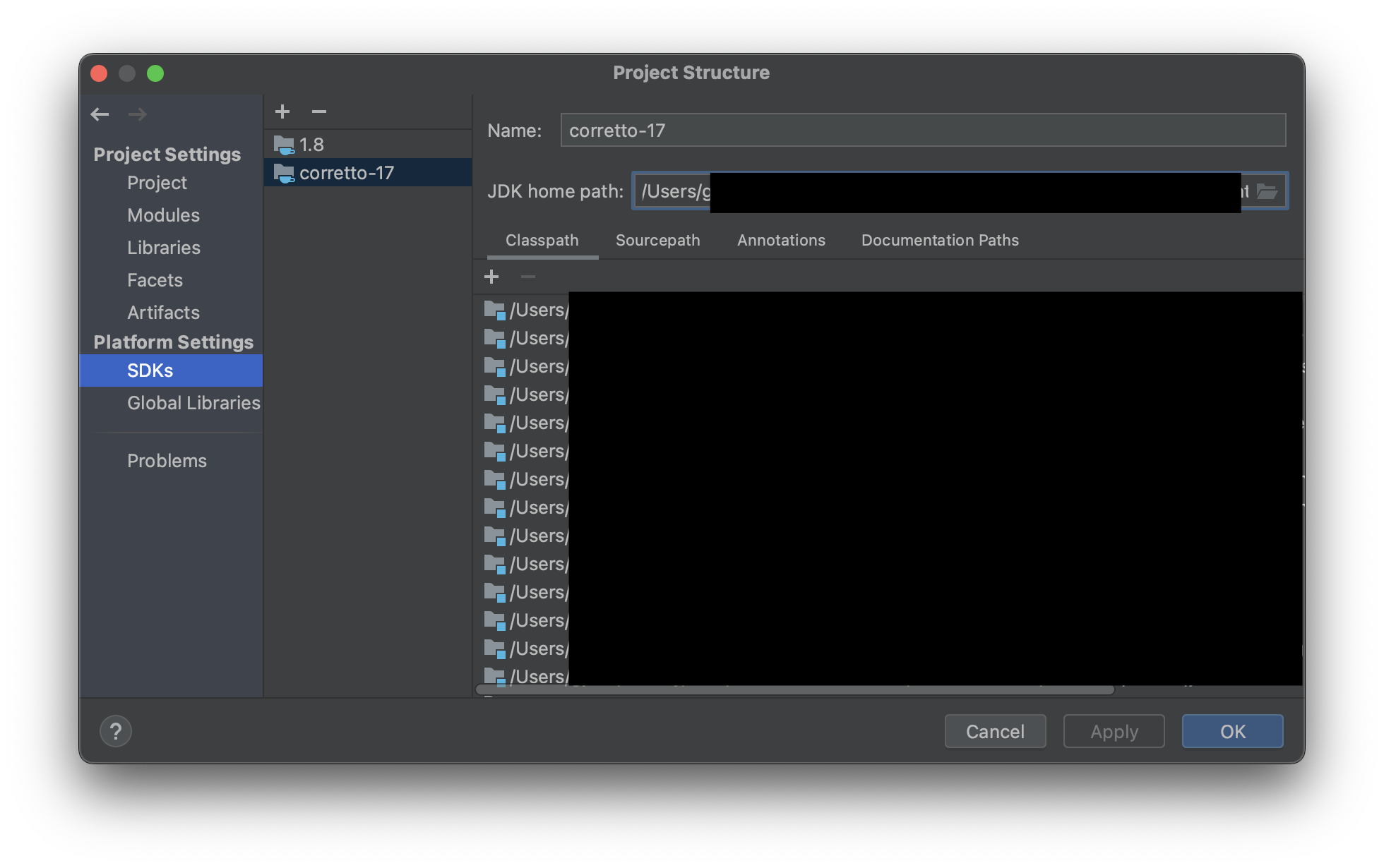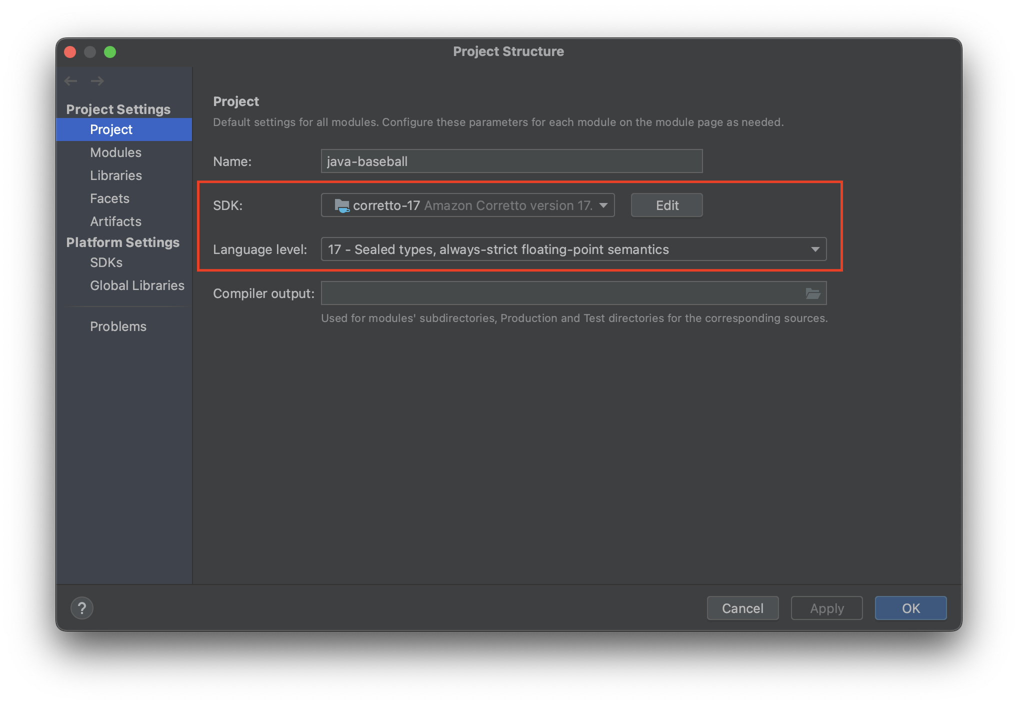 File -> Project Stucture -> SDKs에서 17버전이 있는지 확인하기